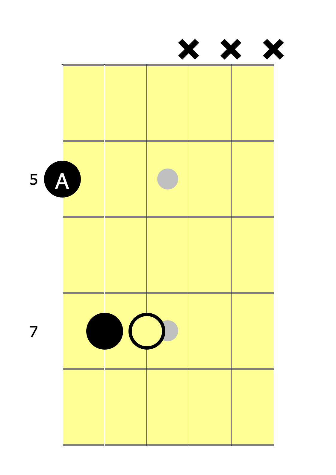 The simplest of all chords are so-called “power chords” or 5-chords. Here’s the shape for an A5 power chord, for example, with the root on the 6th string (the hollow dot is optional — it’s up to you whether to mute or play that note):