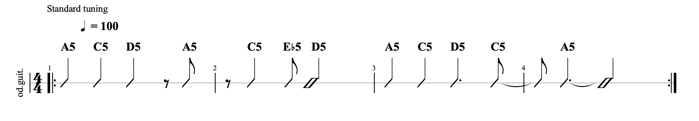 Crank it up and have fun, but remember the purpose of the exercise is to cement the location of the notes into your brain and fingers. It's not for ear training or technique. The idea is to find those notes on the fretboard using the chord names above (A5, C5, D5, ...).