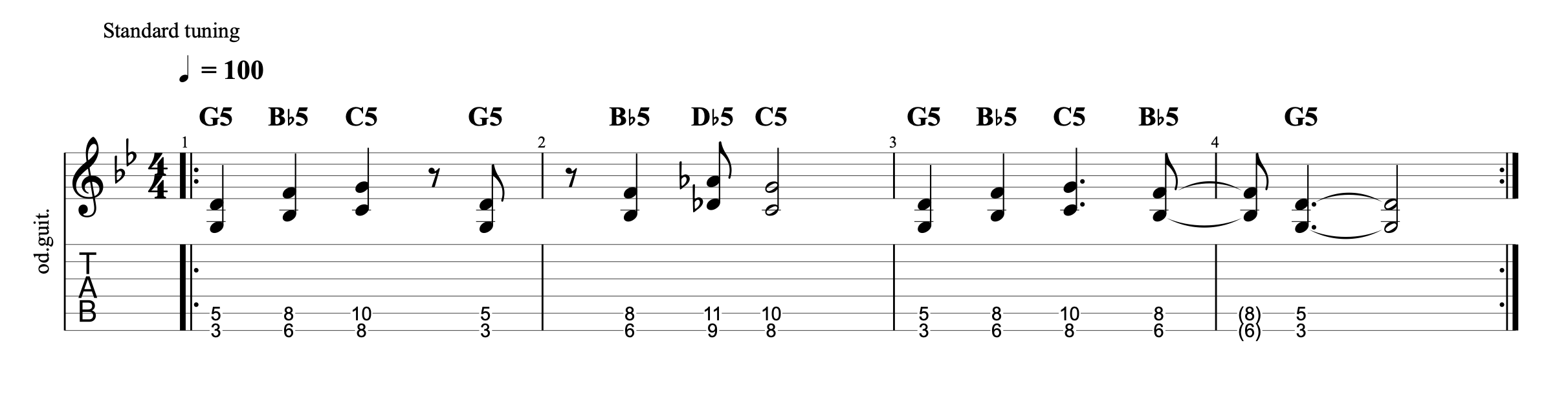 If, by some miracle, you've never heard the riff, and you don't yet know how to read rhythm notation, it sounds like this in Gm. Using power chords rooted on the sixth string isn't the easiest way to play the riff, but it's not all that hard (it helps to play extremely slowly at first).