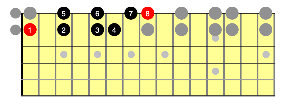 To ensure we start low on the neck, let's start the exercise on the B string. First play the C major scale (CDEFGABC) along the B string: 1st fret, 3rd fret, etc., until you reach the C at the 13th fret.
