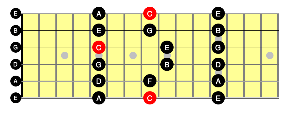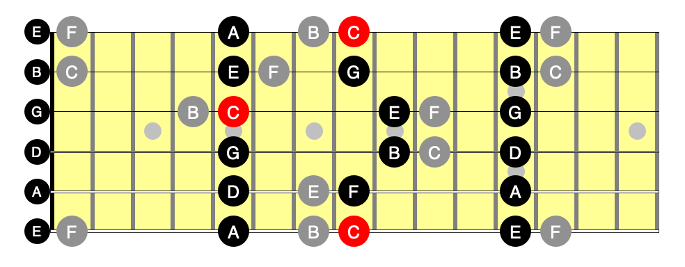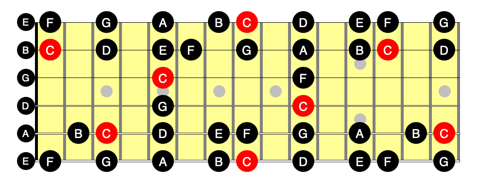 Since we've already learned all the natural note locations on each string, it's trivial to play the C Major scale along any given string: just play each natural note in order. You'll hear the major scale quality (do re mi fa so la ti do) most clearly if you start and end on the note C.
