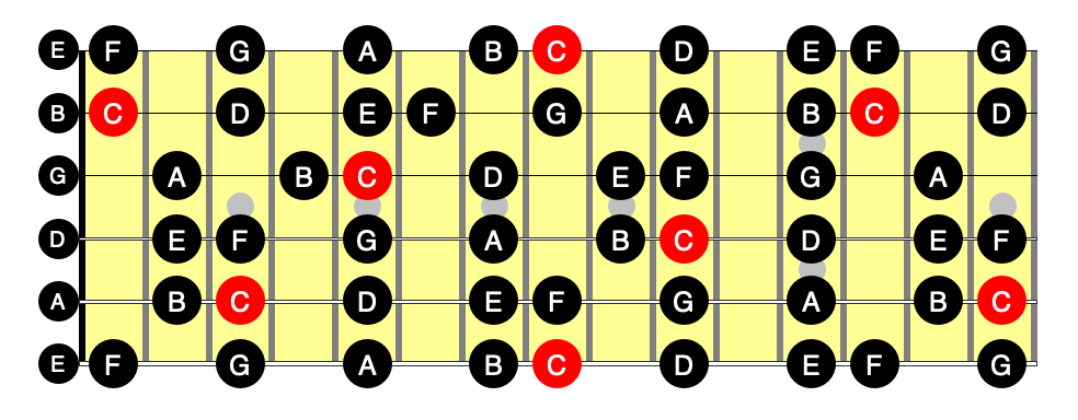 By now you should know this drill well: First find the note B on each string, then the note E, and so on. Play each note in as many places on each string as you can reach.
