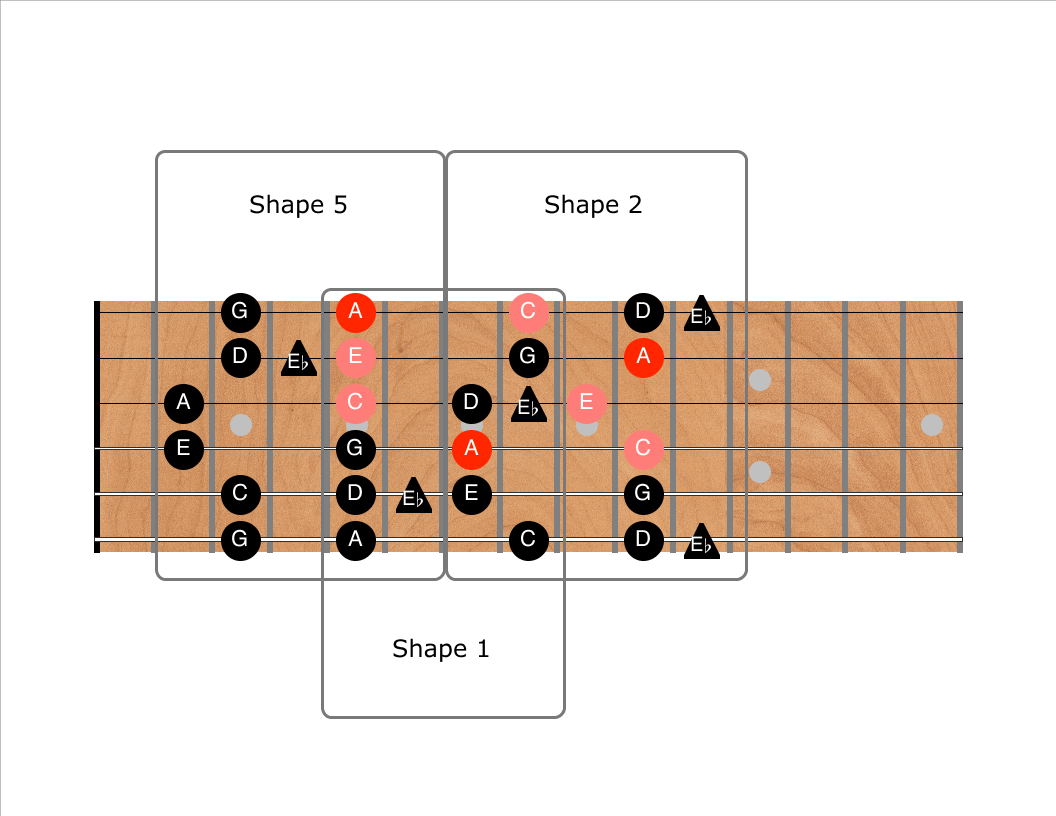 The root notes (A) of the scale are shown in red. The remaining notes in the two Am chord shapes on the top four strings are also shown in salmon. (Note that these chord shapes are just triads on the top three strings, with the highest note doubled on the 4th string in a lower octave.) The “blue notes” are shown with a triangle.