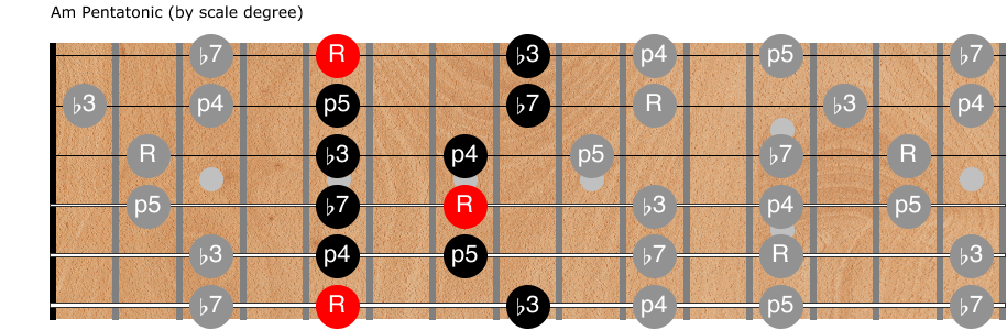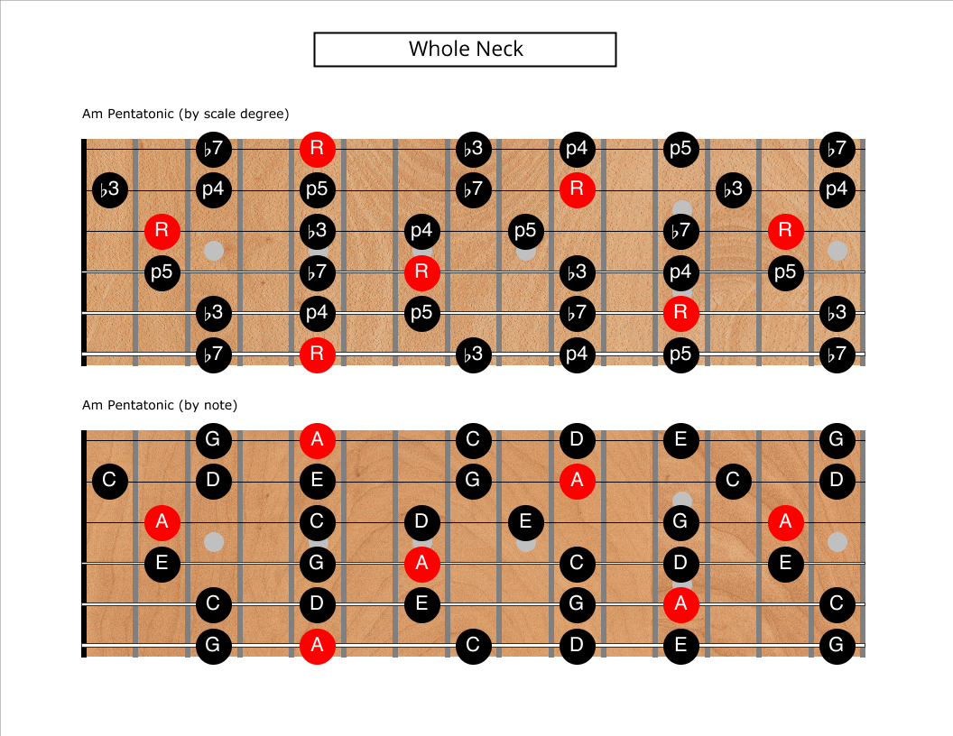 Let’s first look at these five notes in an Am context all over the neck: