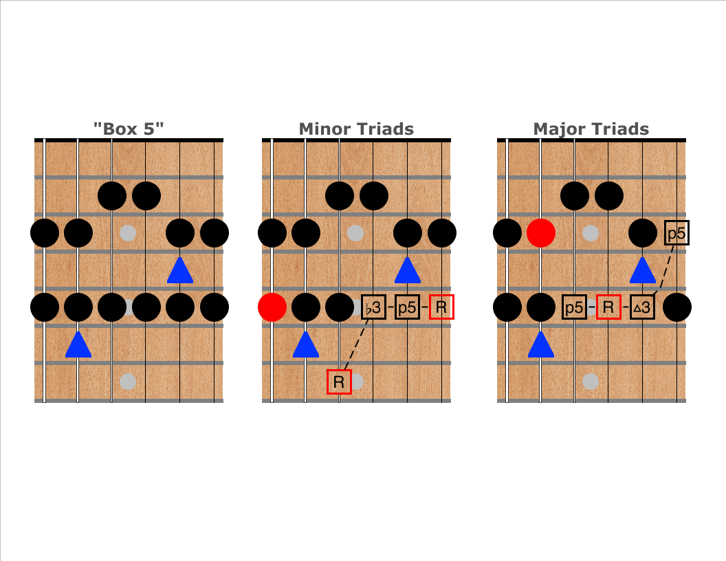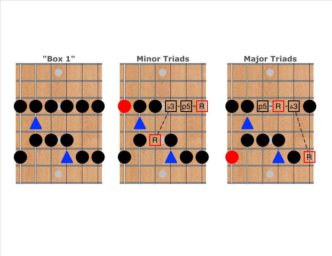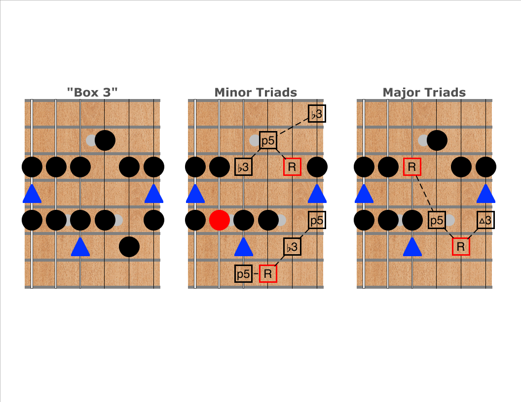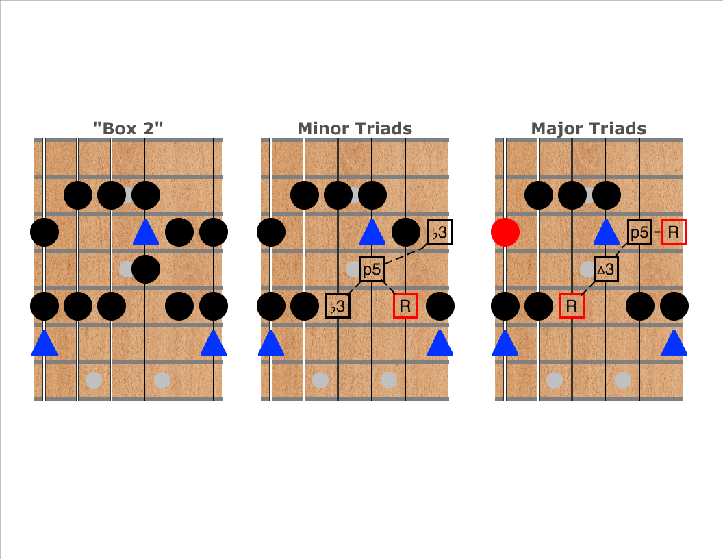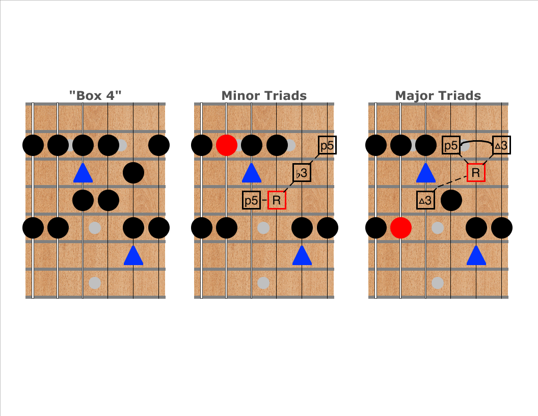 The second and third diagrams show where minor and major triads appear on the top four strings nearby or within the scale shape. Notice that each box shape contains both major and minor triads! Again, the same box can be major or minor depending on which notes are emphasized.