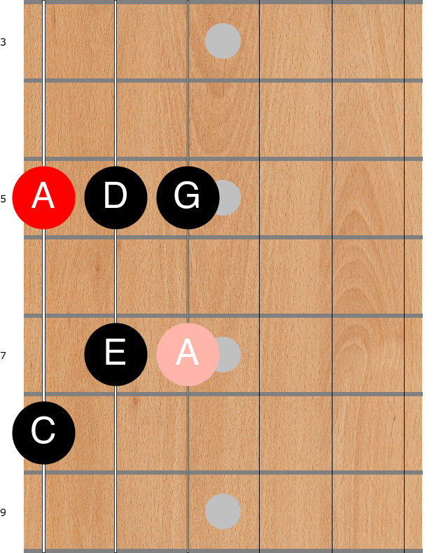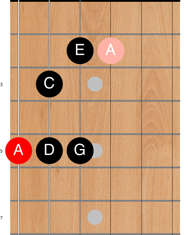 If we start on any A, we can find a C either three frets higher on the same string, or two frets lower on the next string (remember the fret shift when moving between string 3 and string 2, however).