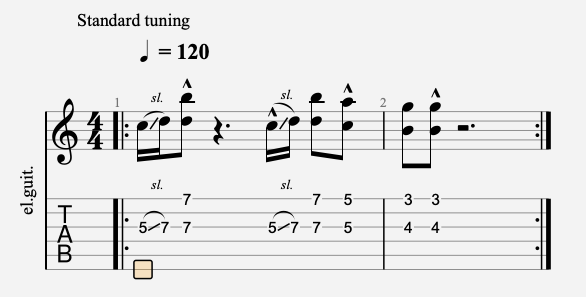 This is played with a fairly straight feel, not swung at all. The backbeat notes (the “ands”) are strongly emphasized (note the hats over the backbeat notes in the tablature). The tab also shows the initial slides.