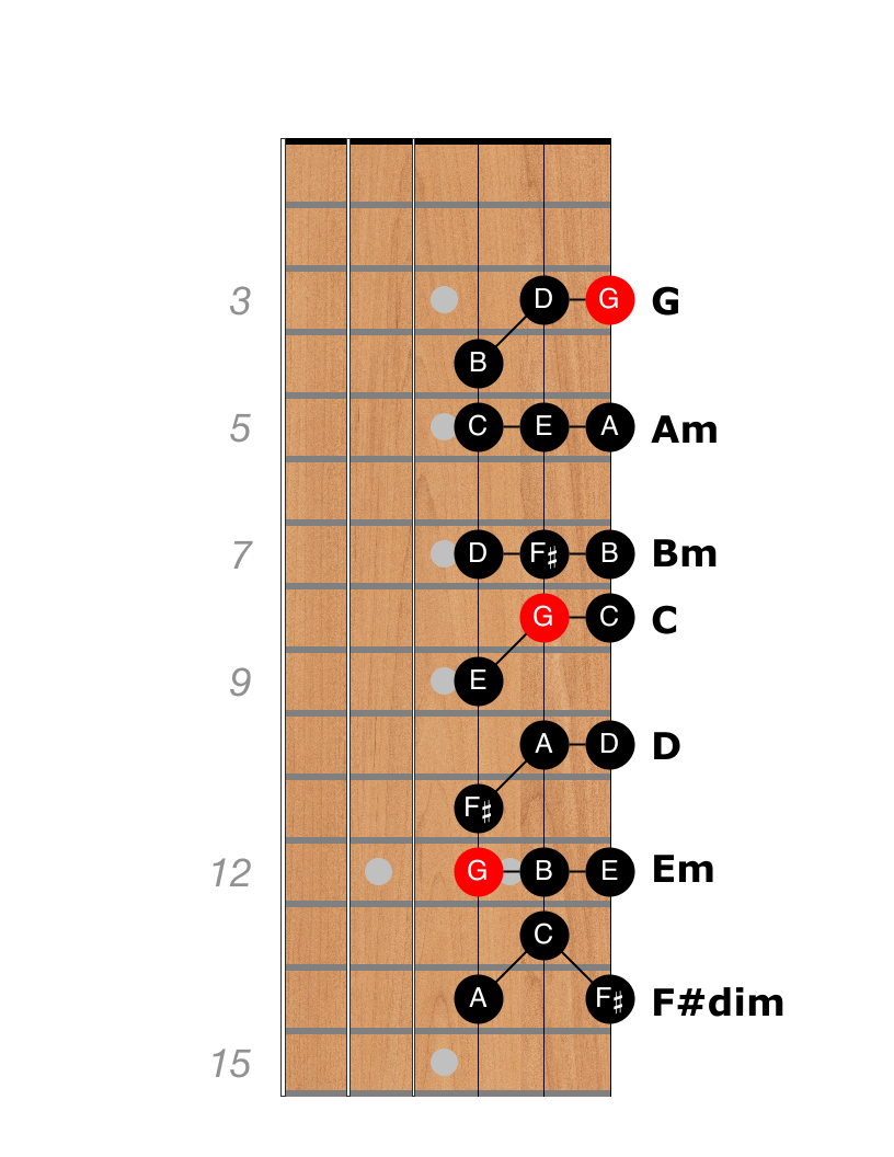 Because all three interval shapes come from the G Major harmonized scale, they provide a very strong flavor of “G”. That’s what makes them sound so cool over a G7 chord (the notes G, B, E, and A) even though a couple of the shapes include non-chord tones (the C and D notes in the Am and Bm shapes).
